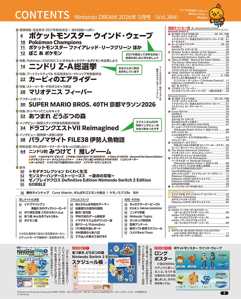 ニンテンドードリーム 26年5月号:付録は『あつまれ どうぶつの森』スケジュール帳/『ポケットモンスター ウインド・ウェーブ』ロングポスター