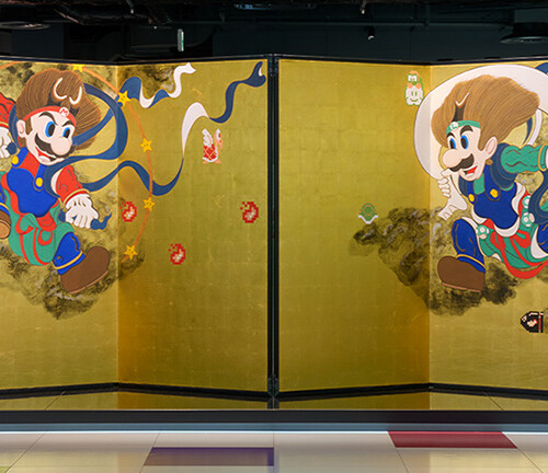 「ニンテンドーミュージアム」第1展示棟2階にオープンした「アートギャラリー」に「マリオ&ルイージ図屏風」が展示