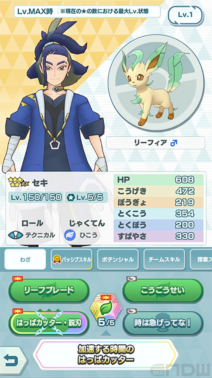 バディーズわざ「加速する時間のはっぱカッター」は、自分の「こうげき」が上がっているほど、威力が上がります。「★5セキ&リーフィア」は、テクニカルのバディーズのため、「★6EX」に★アップすると、バディーズわざの威力が上がります。