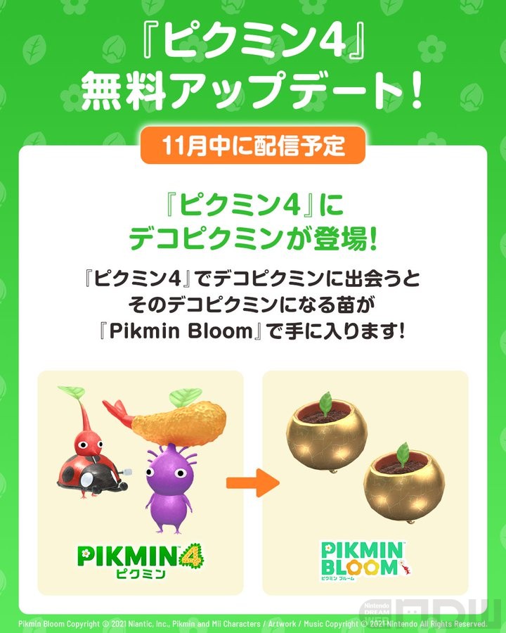 またNintendo Switchソフト『ピクミン4』でも、11月中に配信予定の無料アップデートで、『Pikmin Bloom 』でおなじみのデコピクミンが登場します。