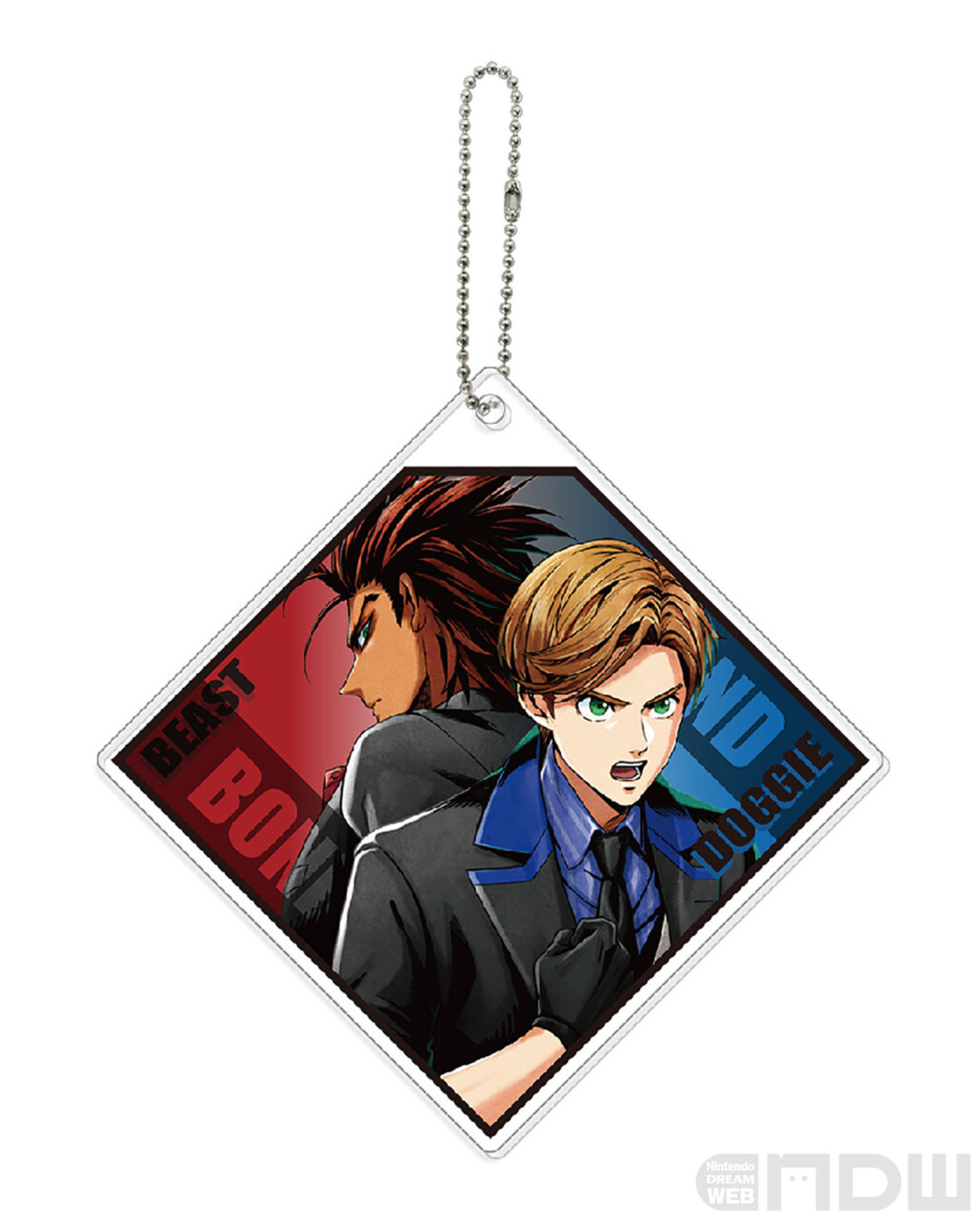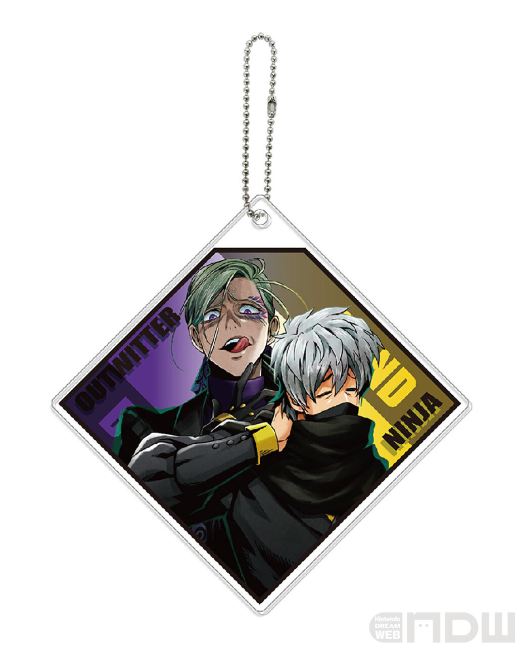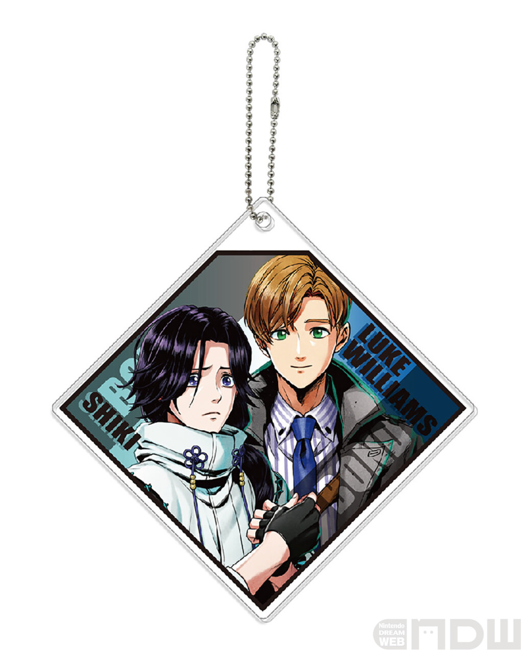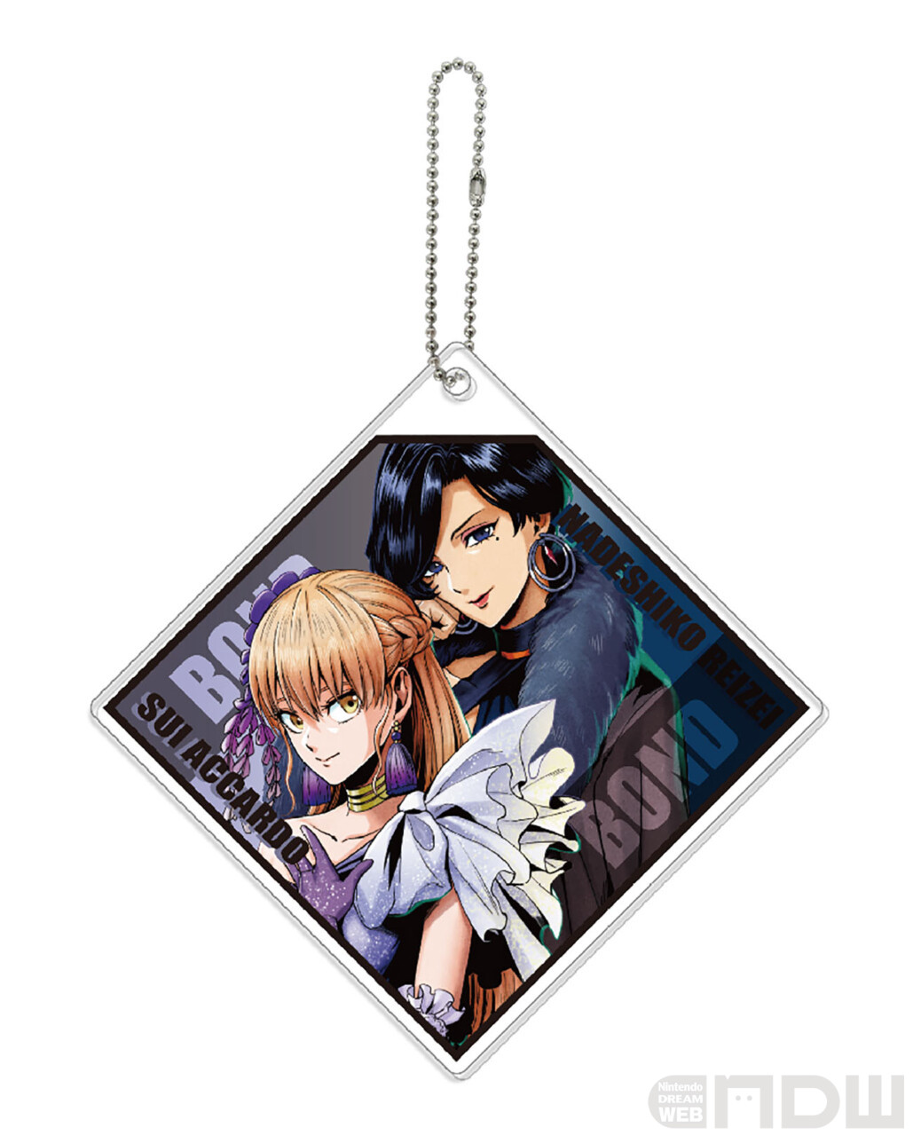 作中で繋がりのある2人のアクリルキーホルダーです。重なった2枚のアクリルそれぞれにキャラが1人ずつデザインされています。