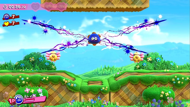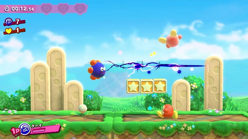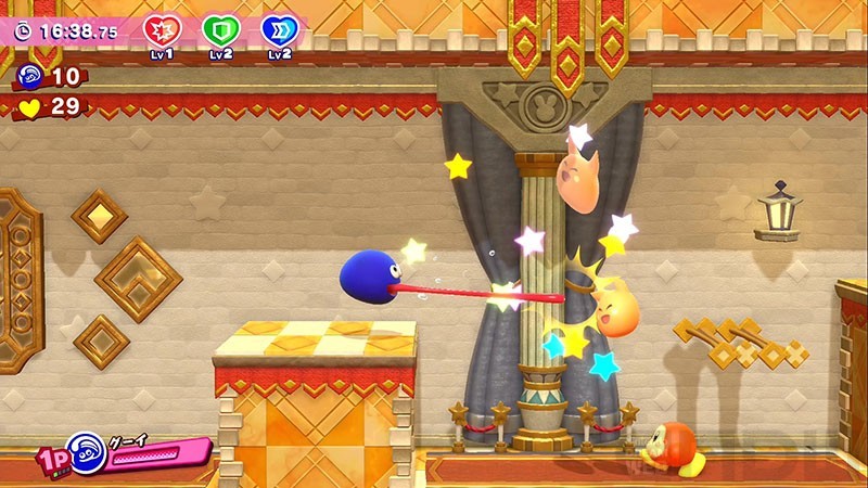 使えるワザは『星のカービィ スターアライズ』とほぼ同じですが、長い舌を使ってつかみ攻撃もできるように。なかなか強力な攻撃が多いです。