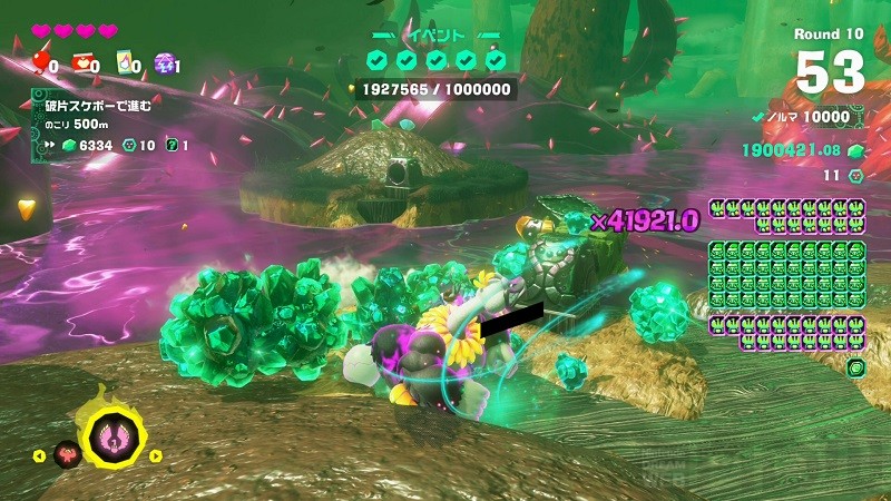 一度倒しても再出現しますが、倒す度にエメラルド出現量が減るので注意しましょう。しっかりとエメラルドパワーを集めてから、最後のラウンドで一気に倒すのもヨシ。下画像ぐらいエメラルドパワーを集めておけば、数体倒すだけで1000000達成できちゃいます。