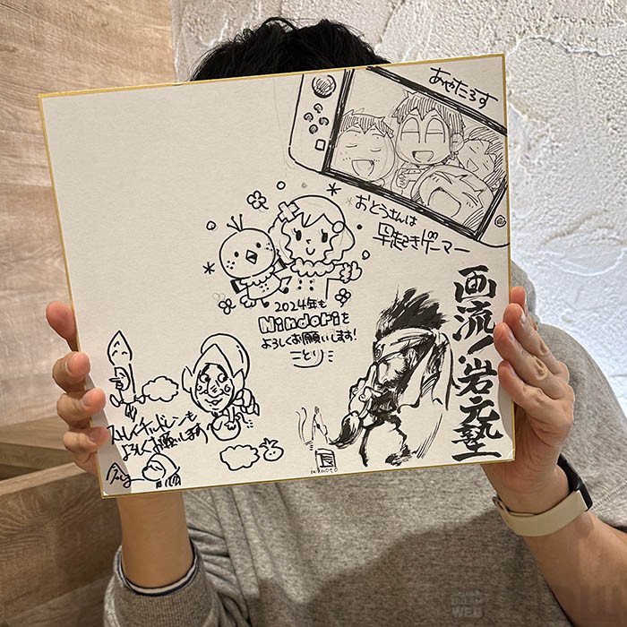 現在ニンドリで連載を担当してくださっている、ことりさん、倉島一幸さん、岩元辰郎さん、今村孝矢さん…。著名なゲームの制作陣が集結。そんななか、ふだんはデザイナーをされているあやたろすさん。サインはもちろんアナログ絵を描く機会もほとんどないのだとか。た、たしかに…!