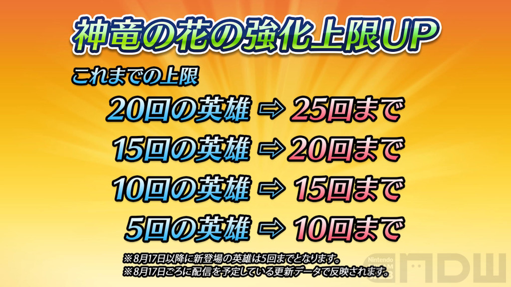英雄に使える「神竜の花」の上限が増えます。 上限解放部分の強化に必要な神竜の花の数は、これまでと同様に40個ずつ増えていきます。※8月17日以降に新登場の英雄は5回までとなります。 ※8月17日ごろに配信を予定している更新データで反映されます。
