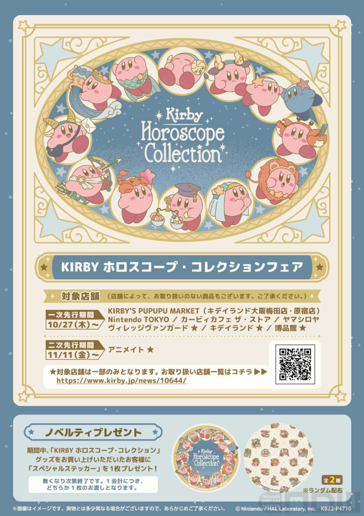 また対象店舗にて「KIRBY ホロスコープ・コレクション」商品を購入すると、先着数量限定でもれなくスペシャルステッカーももらえます。開催店舗については、サイトをご覧ください。