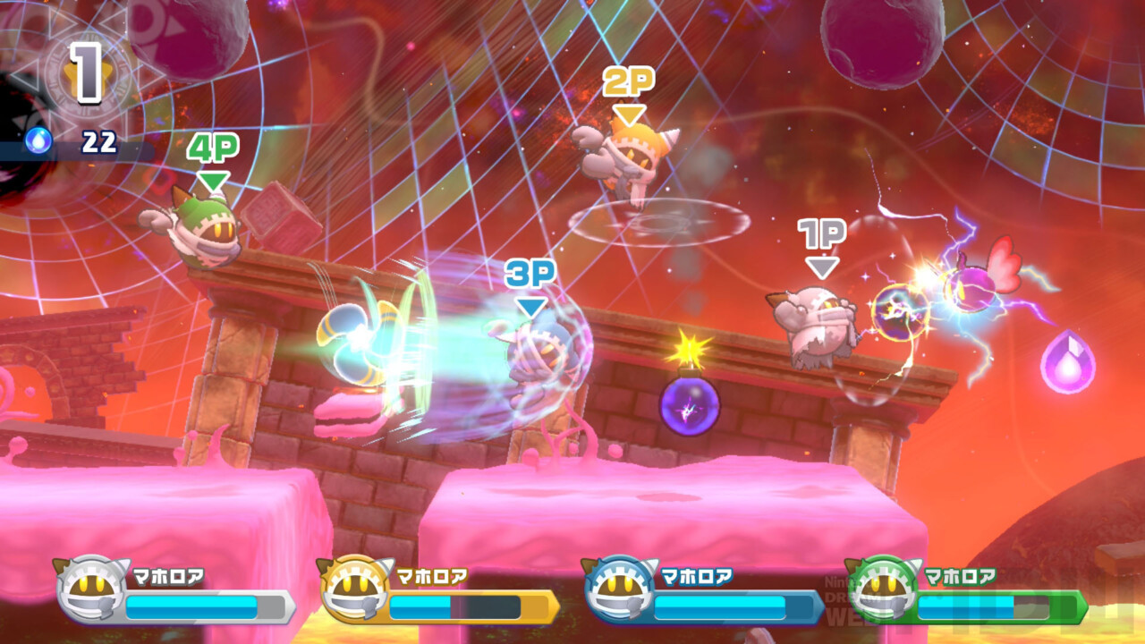 主人公のマホロアはボロボロになってしまい、最初にできることは、ちょっとした攻撃と、わずかに空を飛ぶことだけ。体力も少なく、すぐにやられてしまいます。仕掛けいっぱいの20種類以上のステージが待つ、異空間からの脱出を目指し、マホロアの孤独な旅が始まります(4人でも遊べますが)。