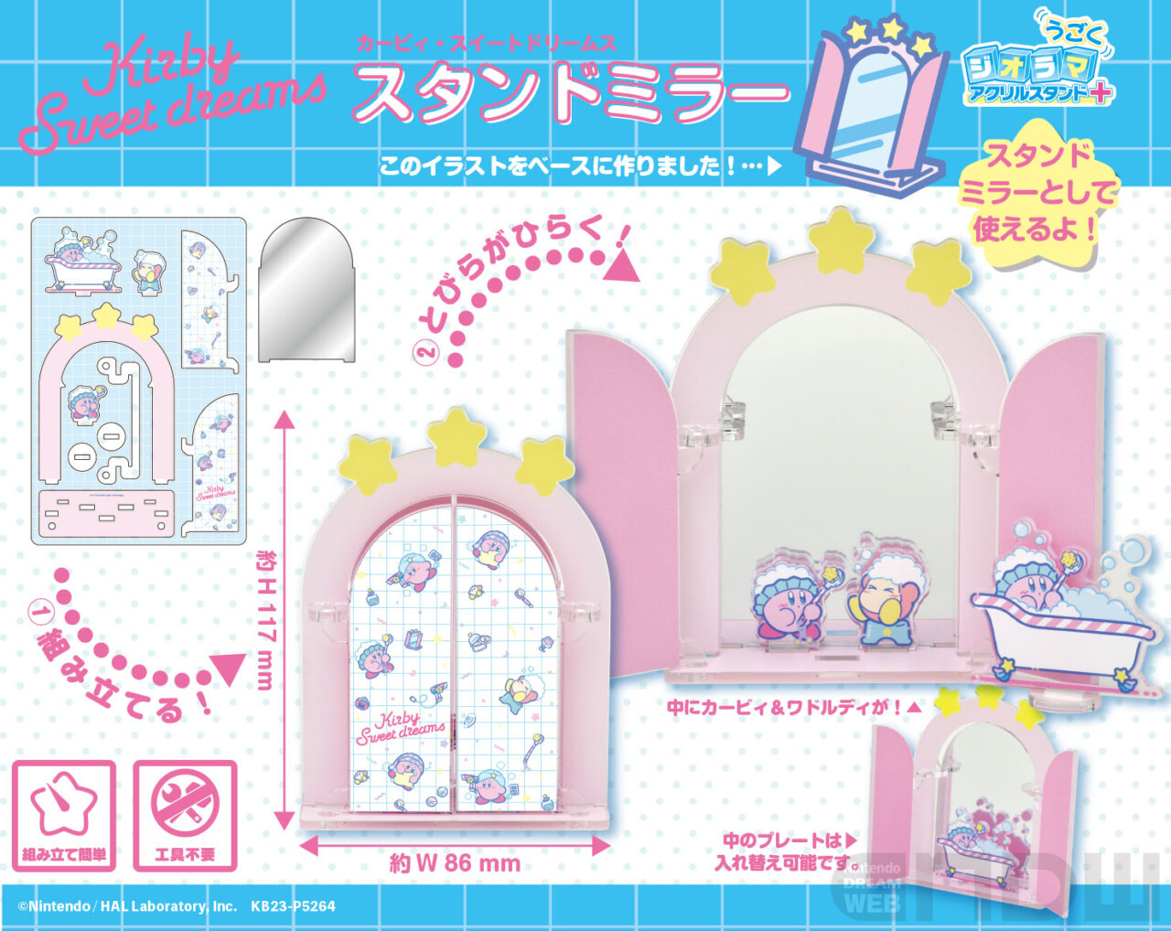 リラックスバスタイムをイメージしたアートワーク「カービィ・スイートドリームス」のデザインを使用した組み立てキット。アクリル製のキットからパーツを外して組み立てると、手のひらサイズのスタンドミラーが完成します。扉を開閉したり、実際に姿を映して使うことができます。