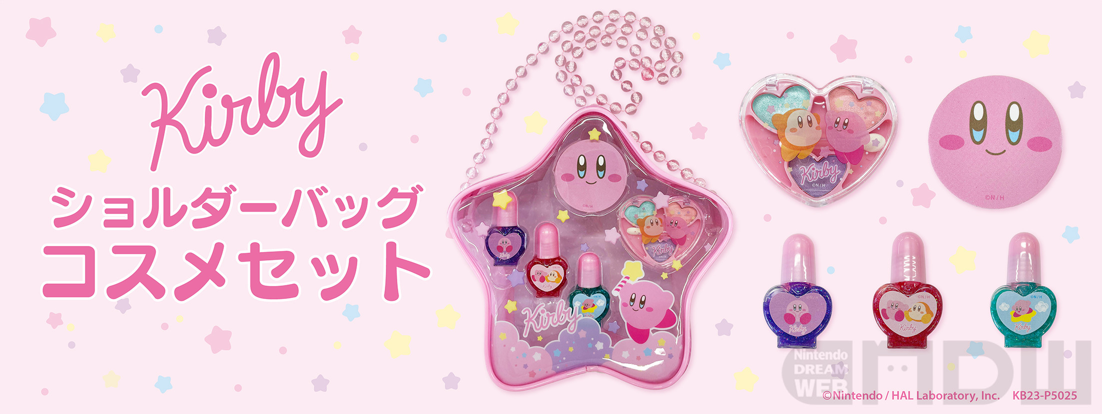 「ショルダーバッグコスメセット」は、カービィがプリントされた星型のバッグに、水性マニキュア3本、アイシャドウパレット、爪やすりの5点がセットになった商品です。