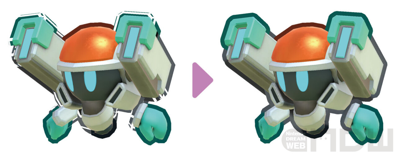 渡辺 少し技術的な話になりますが、アウトラインを表示する一般的な手法に、「背面法」というものがあります。ただ、それだけだと、たとえばカービィの足と体が重なった部分に、ジャギーのようなアウトラインが表示される問題が出てしまうんです。