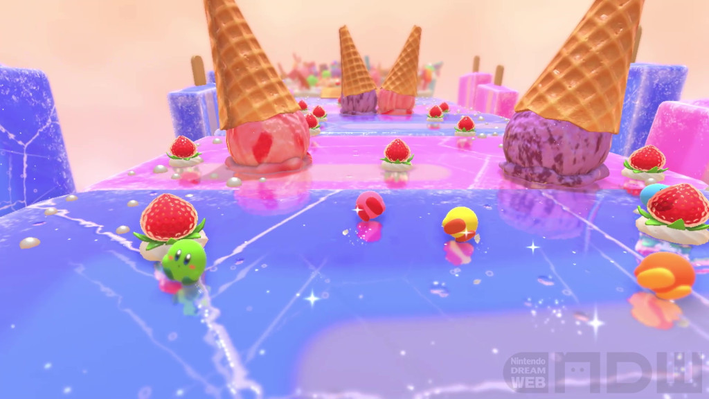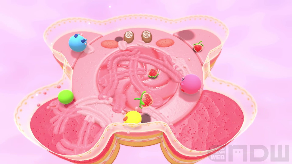 本作は不思議なフォークの力で小さくなったカービィが、お菓子な世界を舞台にグルメバトルを展開。4人のカービィたちが食べたイチゴの量を競い合う対戦アクションゲームになっています。