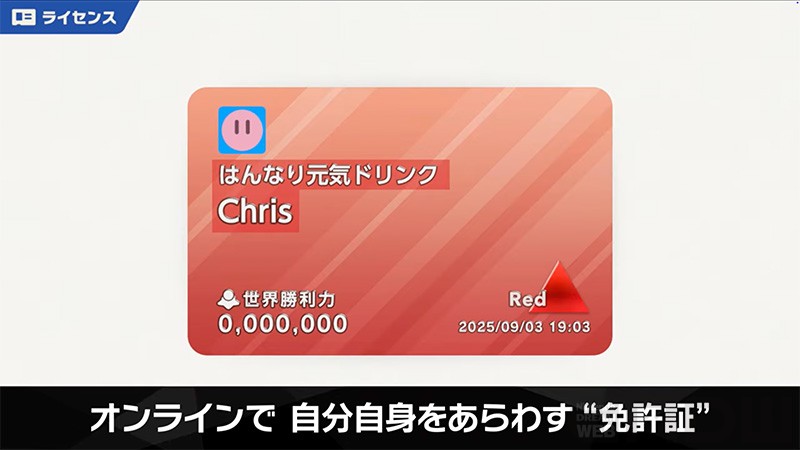 オンラインでは、自分自身を表す免許証の役割を持つ「ライセンス」を作成します。ライセンスには、全ユーザーと勝利数を比較した数値「世界勝利力」や、マッチング層を示す「クラス」が記載されます。ライセンスのデザインはいつでも自由に変更可能です。