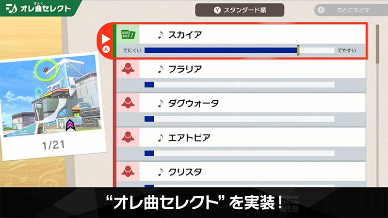 「オレ曲セレクト」は「大乱闘スマッシュブラザーズ」シリーズにも実装されていた機能で、「シティトライアル」の舞台・スカイアで流れる各楽曲の登場確率が調整できます。