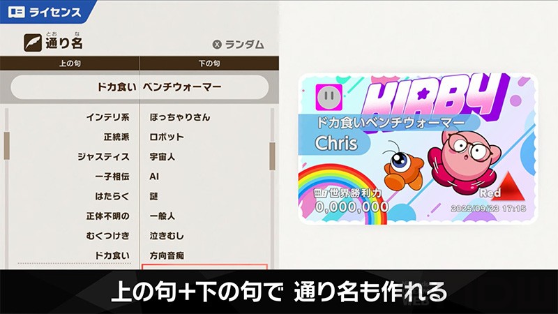 オンラインでは、自分自身を表す免許証の役割を持つ「ライセンス」を作成します。ライセンスには、全ユーザーと勝利数を比較した数値「世界勝利力」や、マッチング層を示す「クラス」が記載されます。ライセンスのデザインはいつでも自由に変更可能です。