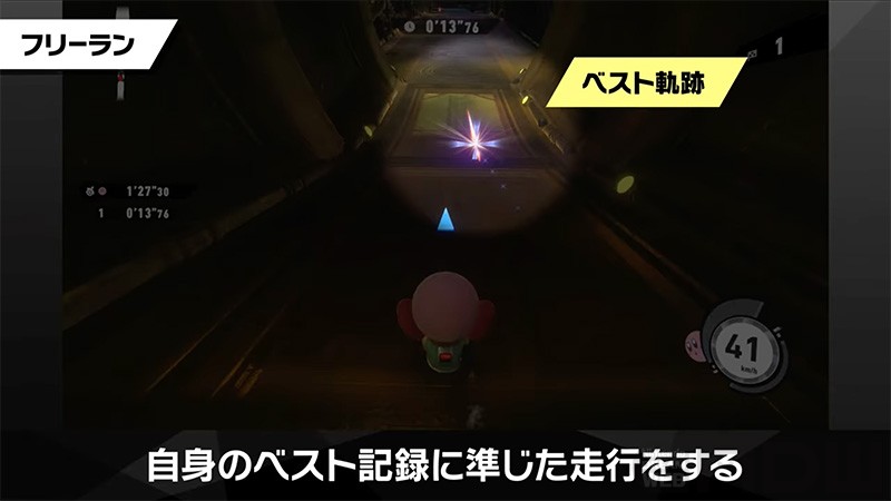 「エアライド」「ウエライド」には、タイムアタックとフリーランのモードがあります。タイムアタックは自己ベスト記録を競うモード。フリーランは、敵がいない状態でスペシャルも使えませんが、“ベスト軌跡”というゴーストのようなものが登場します。