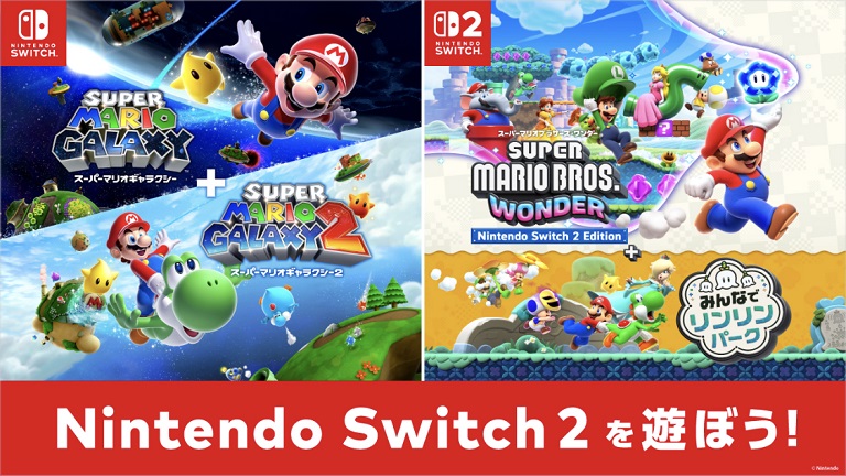 体験会で遊べるのは、Nintendo Switch ソフト『スーパーマリオギャラクシー + スーパーマリオギャラクシー 2』と、Nintendo Switch 2 ソフト『スーパーマリオブラザーズ ワンダー Nintendo Switch 2 Edition + みんなでリンリンパーク』。体験するとゲームのステッカーがプレゼントされます。