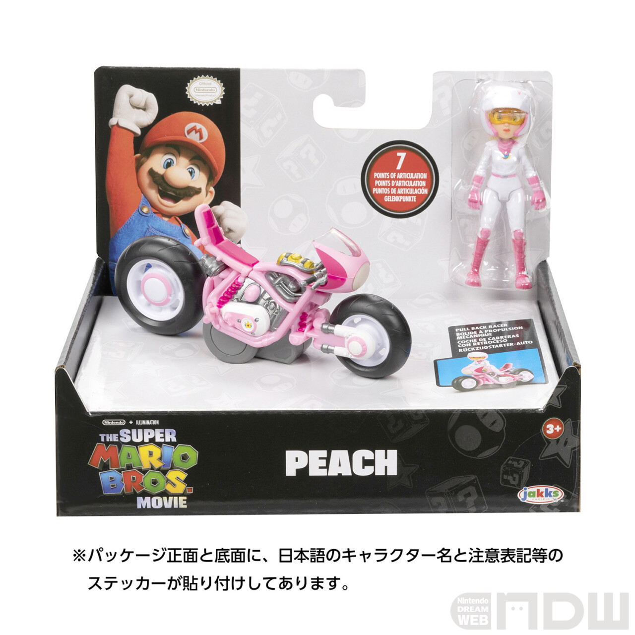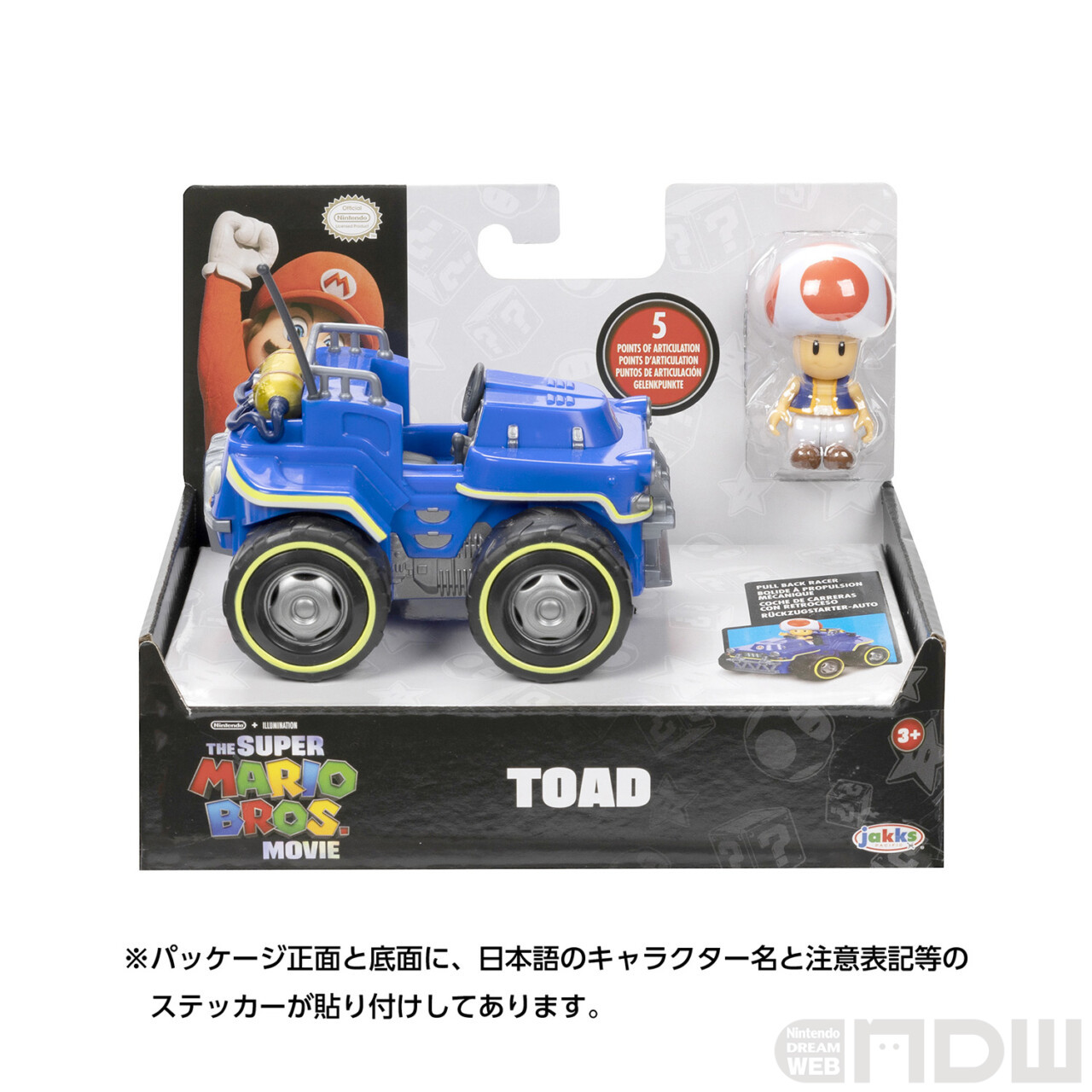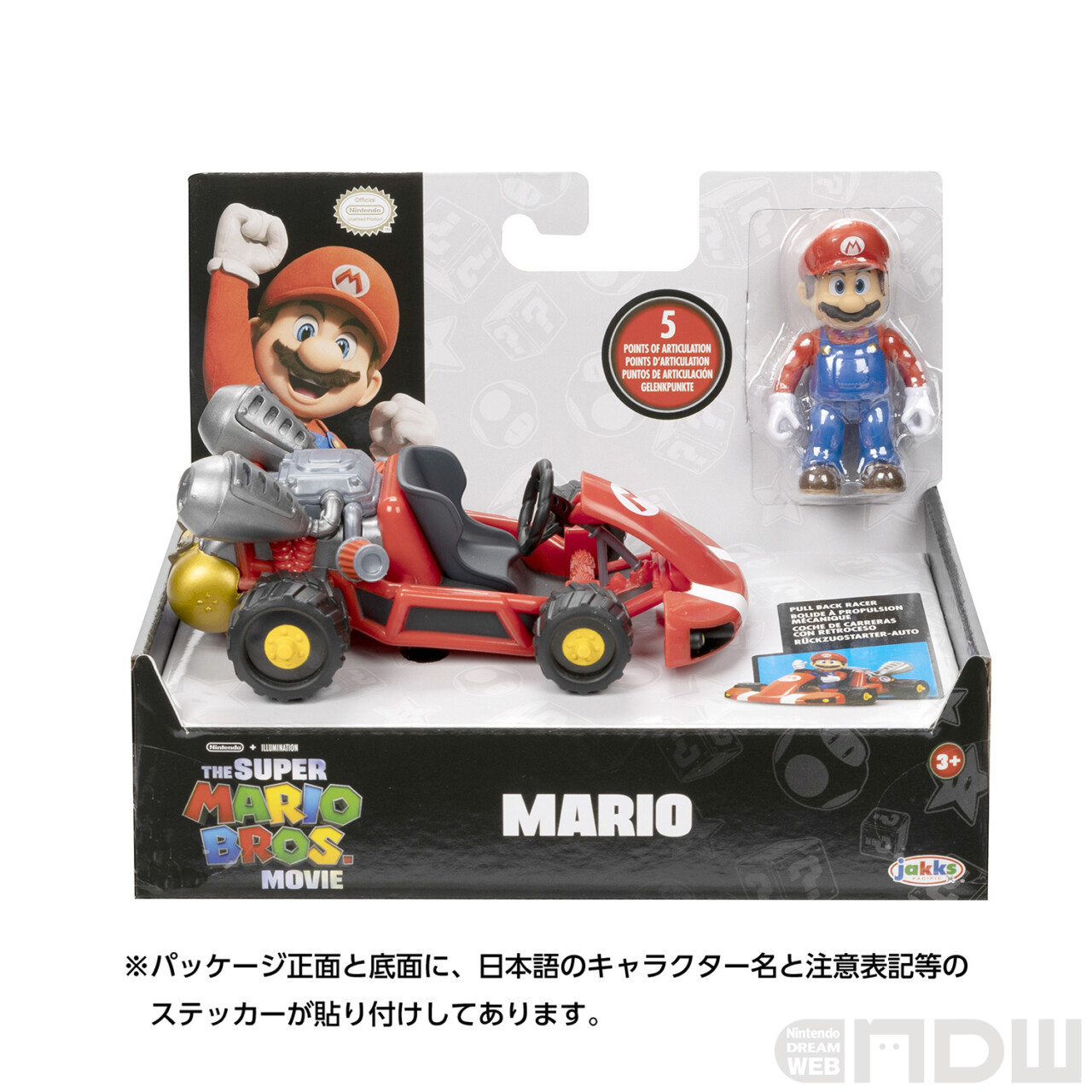 プルバックカートは、マリオ、ピーチ、キノピオ、ノコノコの 4 種。手で後ろに引くと走り出すプルバック仕様で、フィギュアは着脱可能です。カートは映画に登場するオリジナルデザインとなっています。