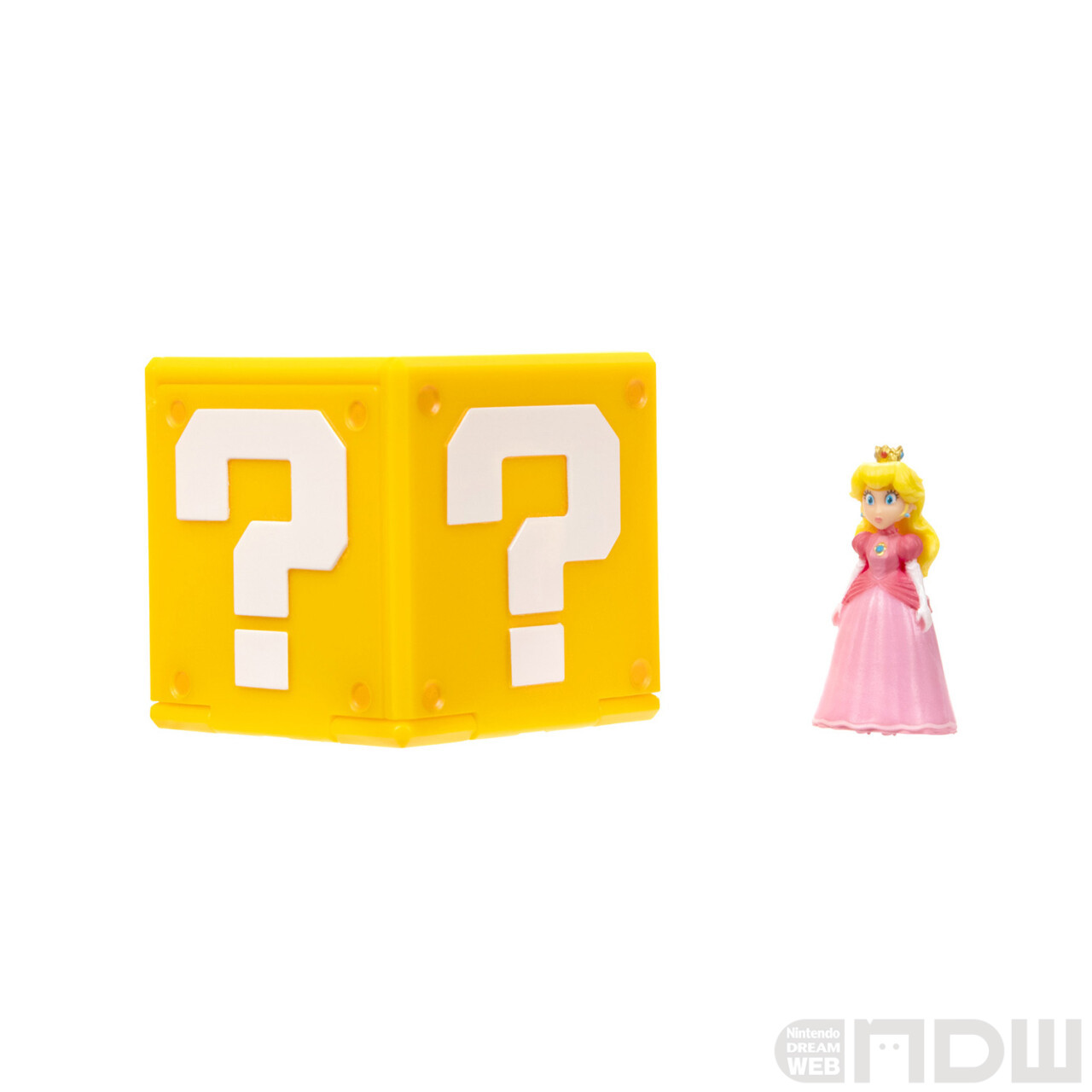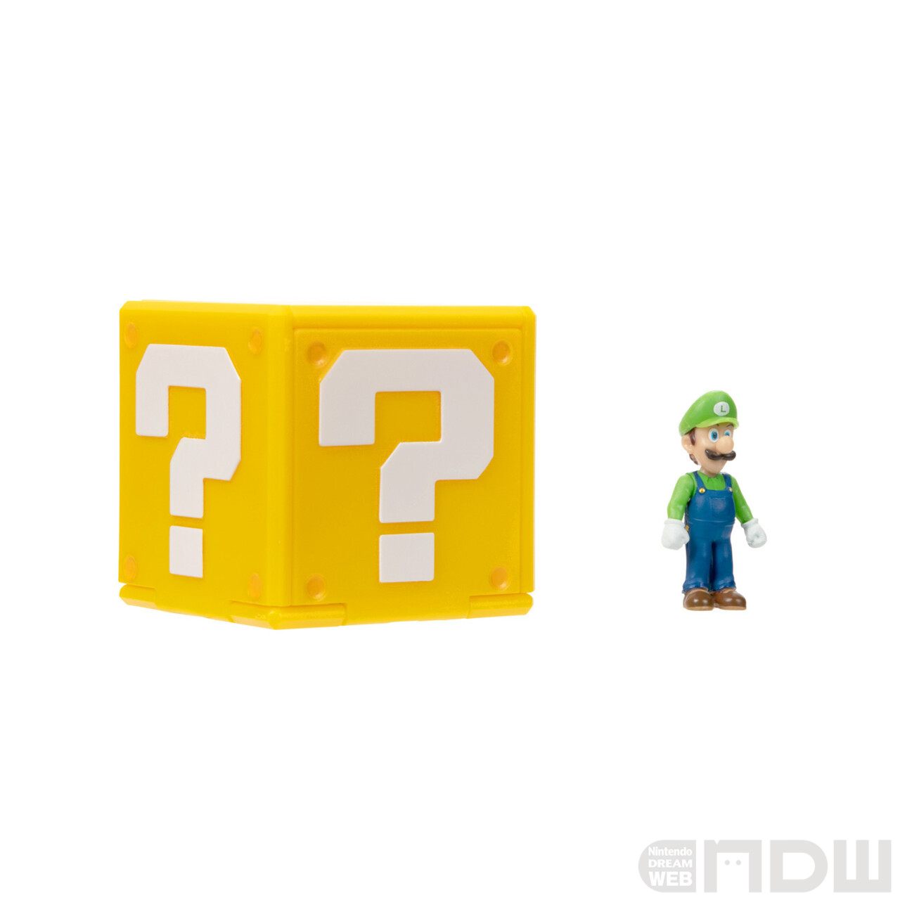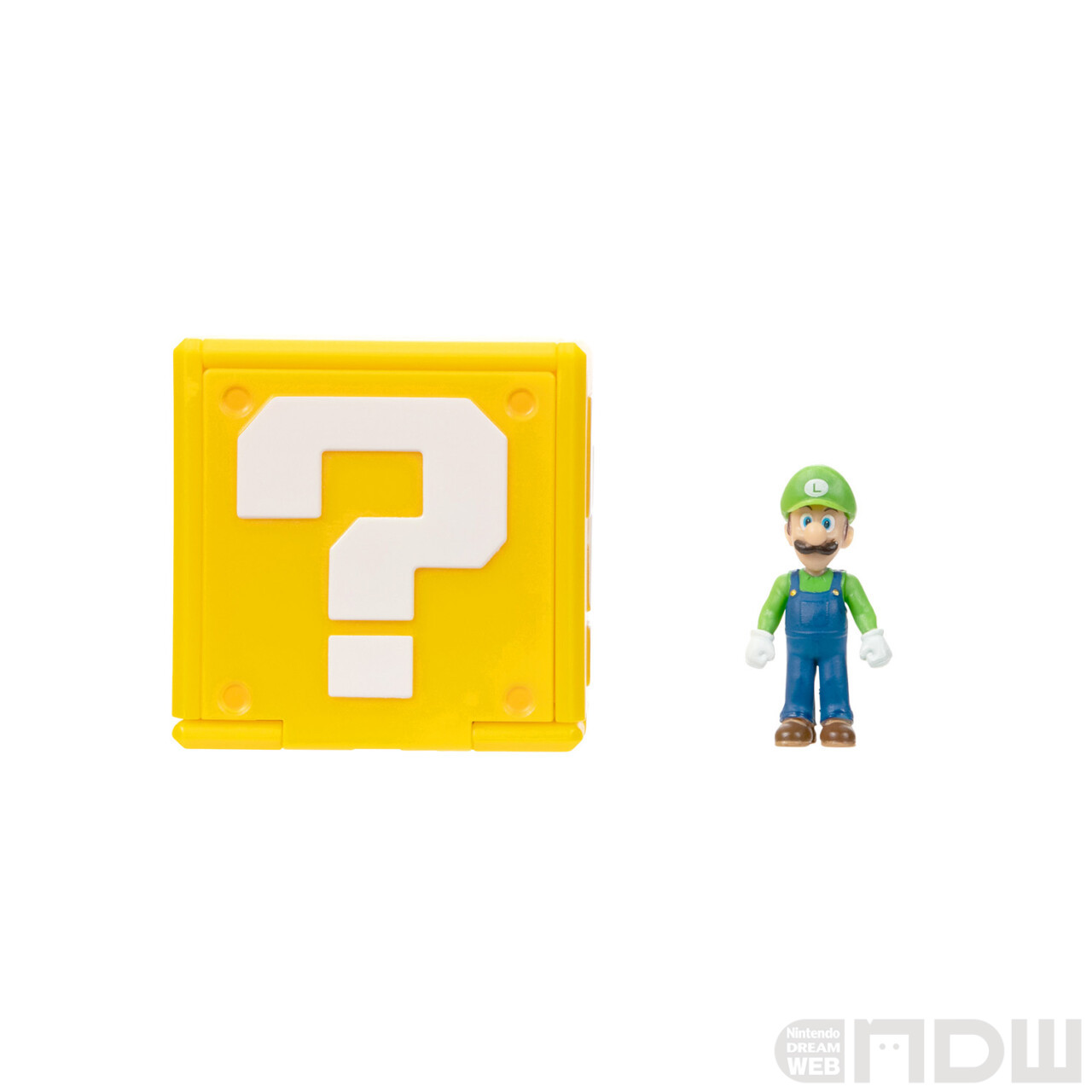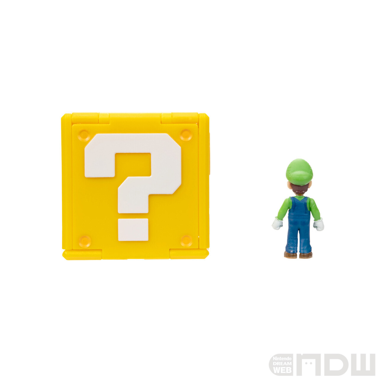 ミニフィギュアは、マリオ、ルイージ、ピーチ、キノピオ、パタパタ、カメックの 6 種。高さ約 3cmと小さなサイズですが、付属のハテナブロックを展開して広げると映画の場面背景が現れ、遊ぶことができます。