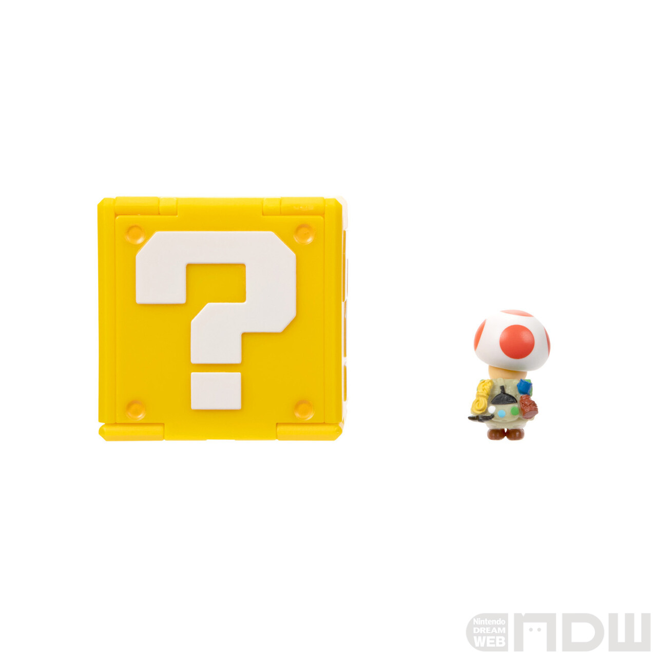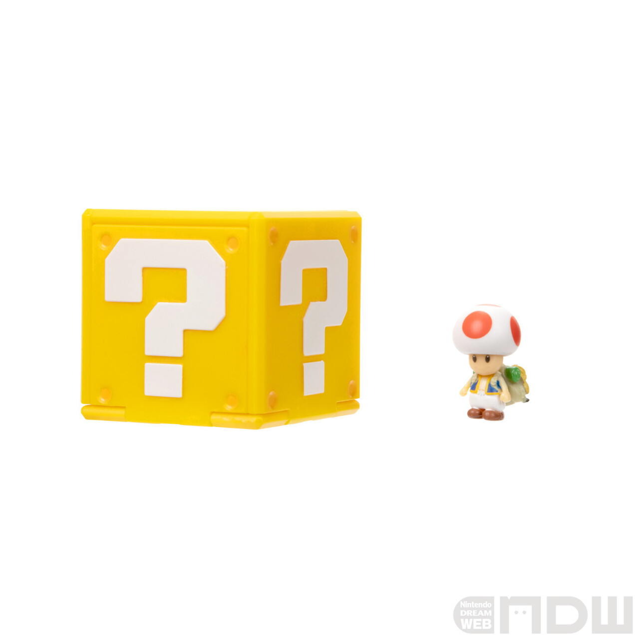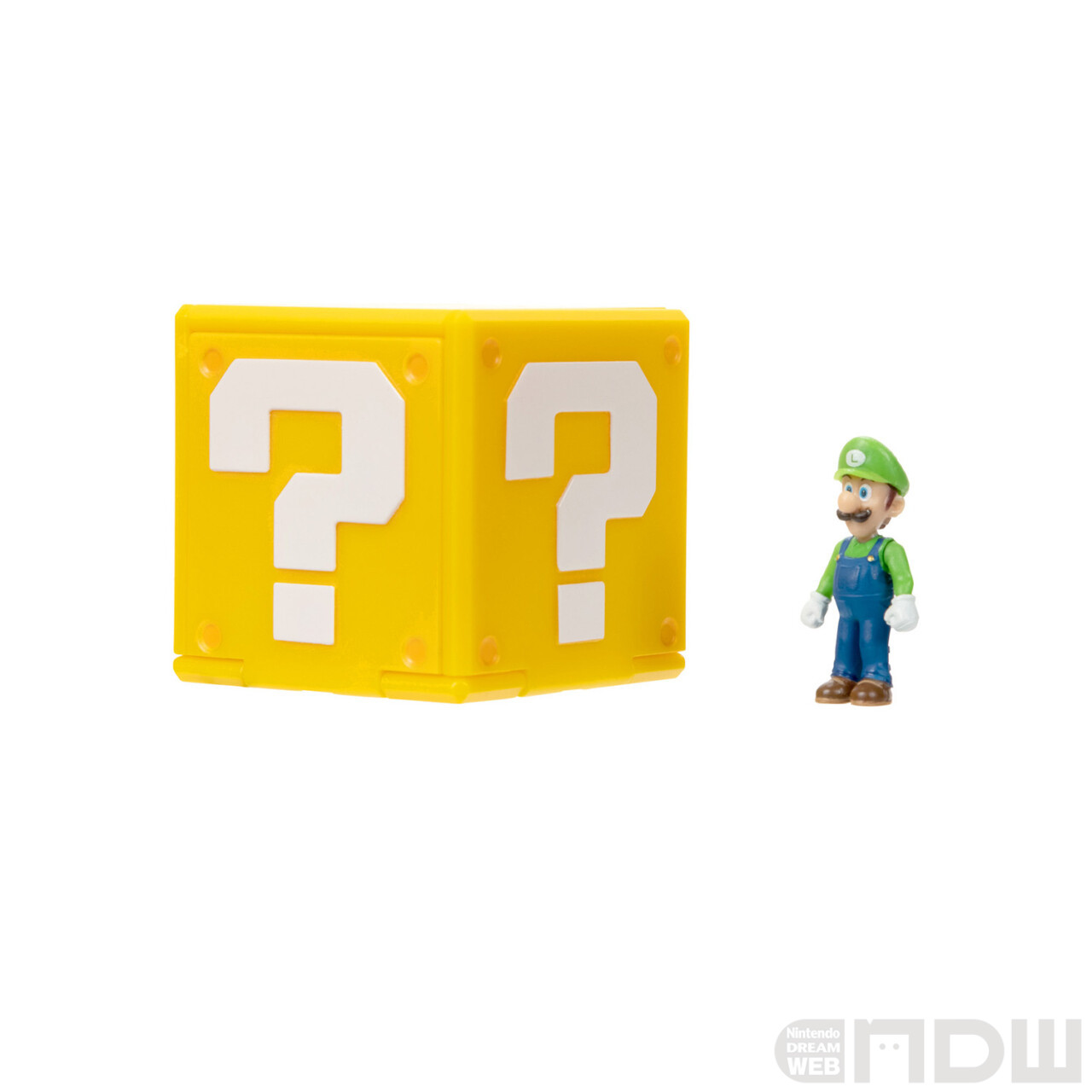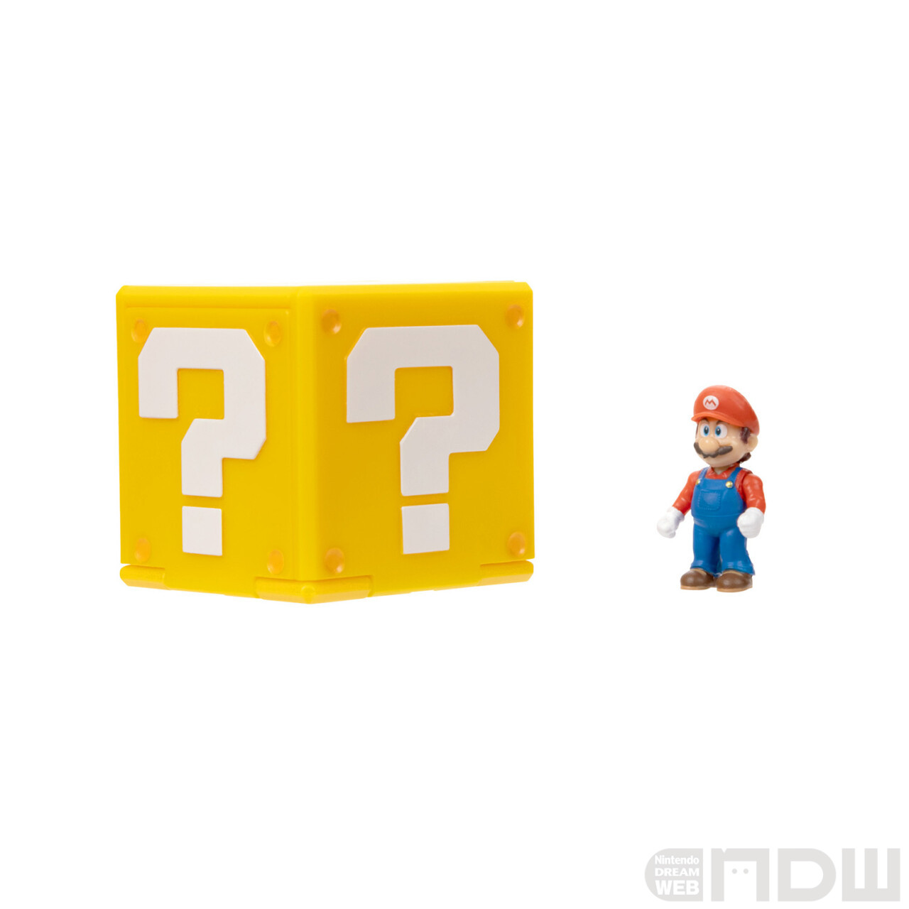ミニフィギュアは、マリオ、ルイージ、ピーチ、キノピオ、パタパタ、カメックの 6 種。高さ約 3cmと小さなサイズですが、付属のハテナブロックを展開して広げると映画の場面背景が現れ、遊ぶことができます。