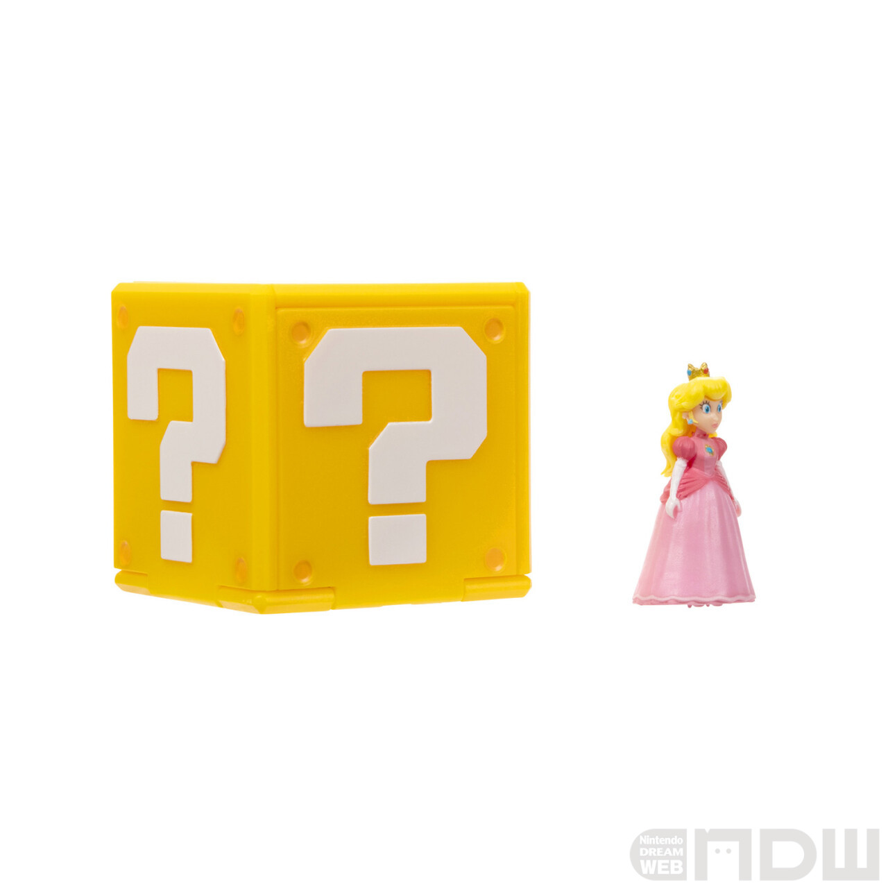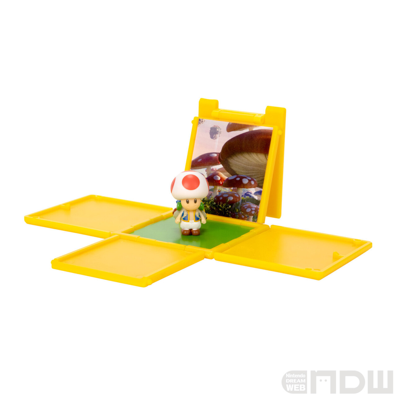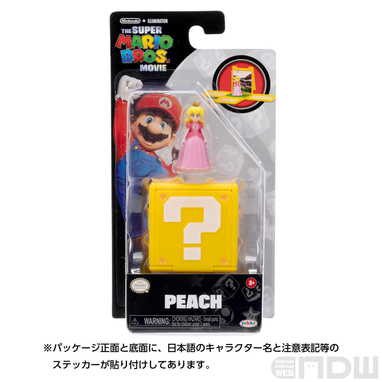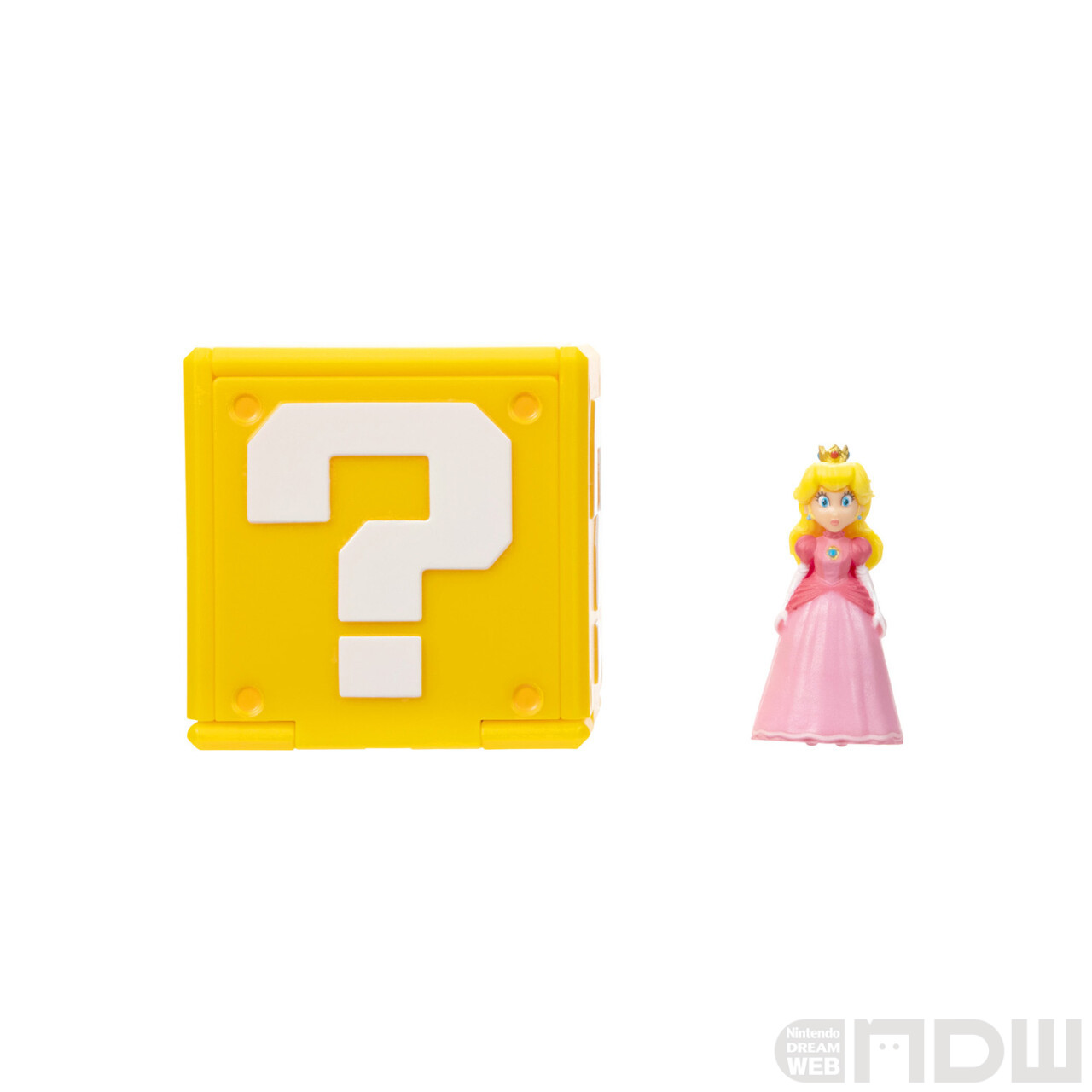 ミニフィギュアは、マリオ、ルイージ、ピーチ、キノピオ、パタパタ、カメックの 6 種。高さ約 3cmと小さなサイズですが、付属のハテナブロックを展開して広げると映画の場面背景が現れ、遊ぶことができます。