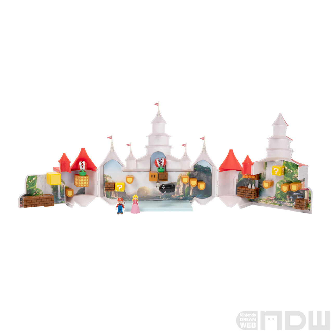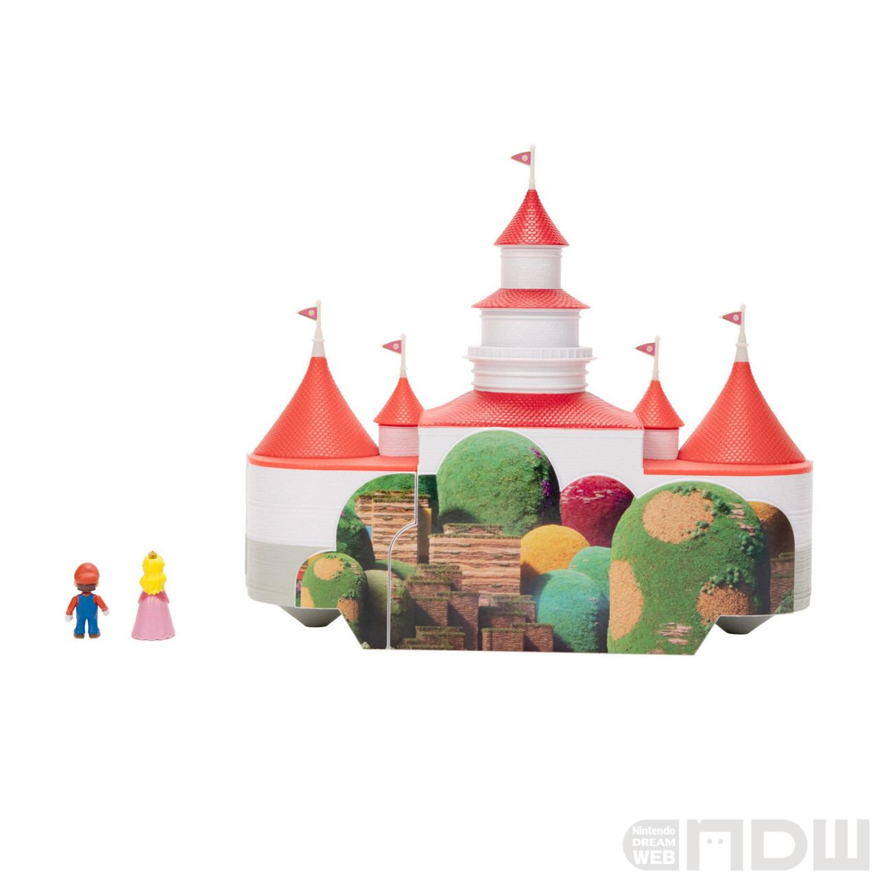 プレイセットは、ピーチ城とバンの 2 種。それぞれ展開して広げると映画の場面を再現した情景に変わります。ピーチ城にはマリオとピーチのミニフィギュアが、バンは手で走らせることができ、マリオのミニフィギュアが付属します。他のミニフィギュアと合わせることでより一層楽しむことができる商品です。