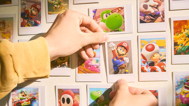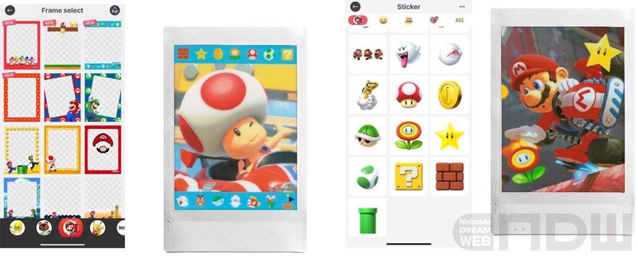 多彩なキャラクターのフレーム(147点)やステッカー(167点)を、撮影したゲーム画像やお気に入りの画像と組み合わせることで特別なチェキプリント™を作ることができます。『あつまれ どうぶつの森』『Splatoon3』など、好きなキャラクターを選ぶことができますが、今回「スーパーマリオ」のフレームとステッカーに新しいデザインが登場します。