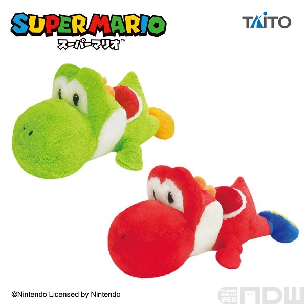 柔らかい素材でできた、約45cmのヨッシーのぬいぐるみ。みどりとあかの2種類があります。