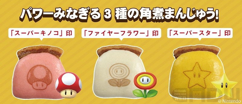 限定発売となる「スーパーマリオ」とのコラボ角煮まんじゅうには、3種類のアイテム印をあしらい、それぞれのアイテムをイメージした色合いの生地で仕上げられています。