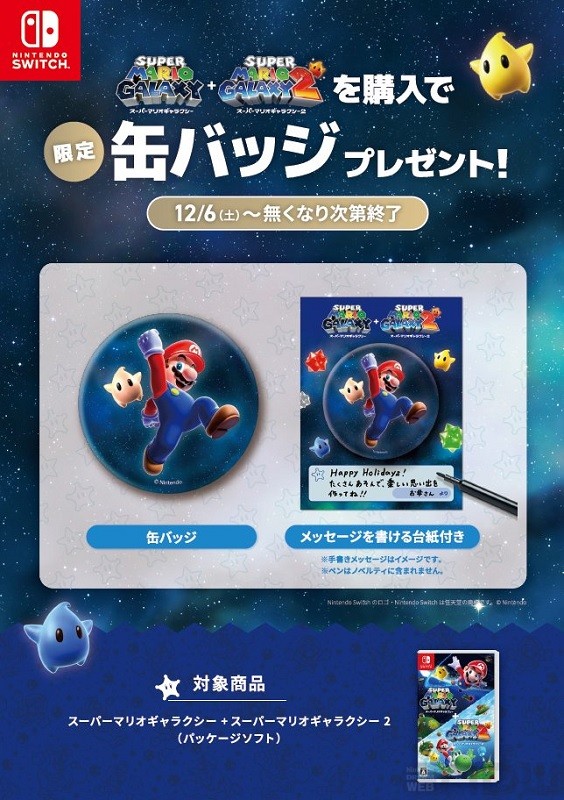 Nintendo Switchソフト『スーパーマリオギャラクシー + スーパーマリオギャラクシー 2』(パッケージ版)を購入すると、限定缶バッジがプレゼントされます。