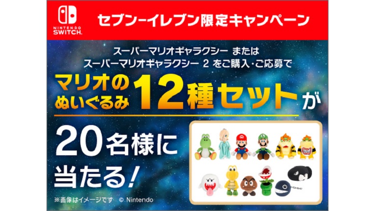 対象となるのは、スーパーマリオギャラクシー』または『スーパーマリオギャラクシー2』ダウンロードカード。全国のセブン-イレブンで購入してキャンペーンサイトより応募すると、抽選で20名にマリオのぬいぐるみ12種セットが当たります。