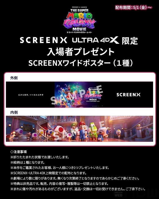 5月1日(金)より、SCREENX ULTRA 4DXで映画「ザ・スーパーマリオギャラクシー・ムービー」を鑑賞すると、入場者特典としてSCREENXワイドポスター(1種)がプレゼントされます。全国3万名限定で、なくなり次第終了となります。