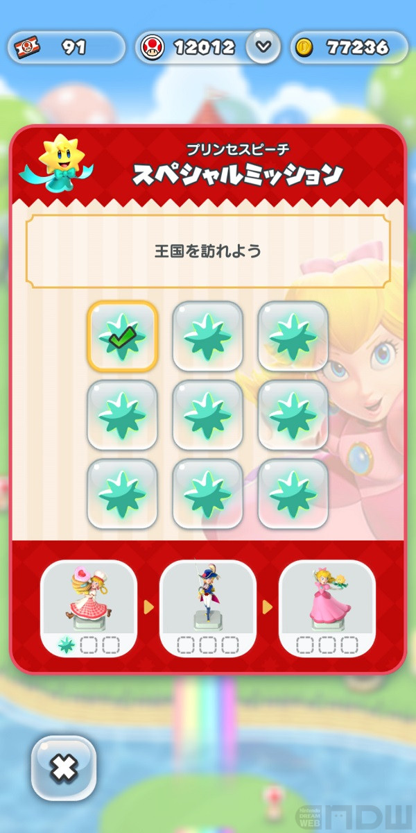 『プリンセスピーチ Showtime!』とのコラボとなる本イベントは、9つのスペシャルミッションに挑戦し、達成数に応じて変身姿のピーチの像が手に入るというもの。