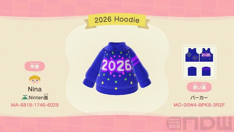 Nintendo Switch『あつまれ どうぶつの森』の「Ninten島」にて、オリジナルのマイデザイン「2026のニットキャップ」「2026のパーカー」「2026のフラッグ」が配布されています。