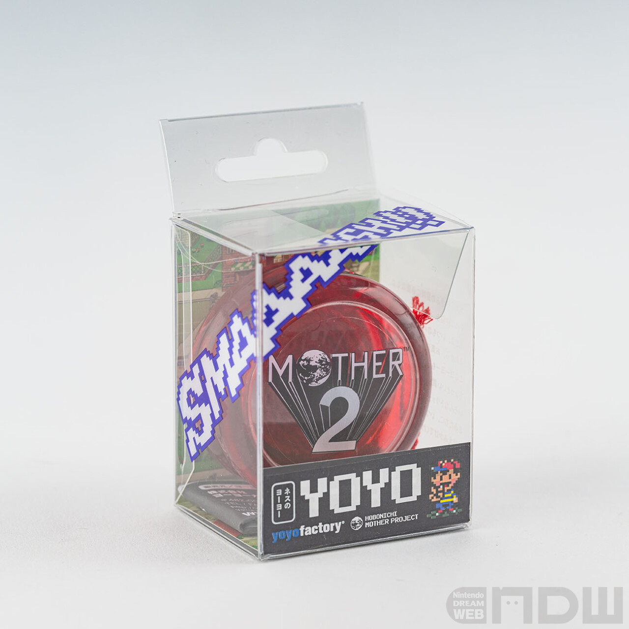 今回販売されるヨーヨーのデザインは、『MOTHER』の赤を基調にしたスケルトン仕様で、ボディ中央にロゴがあしらわれています。実際にネスがロゴ入りのヨーヨーを使っているかはどうでもいいのです。カッコ良すぎますね。実用性だけでなく、ふだん飾っておけるように「SMAAAASH!!」の文字が映える、透明なプラスティックケースに入れられているのも本当にうれしい。遊ぶ用と観賞用の2つ欲しいぐらいですね。
