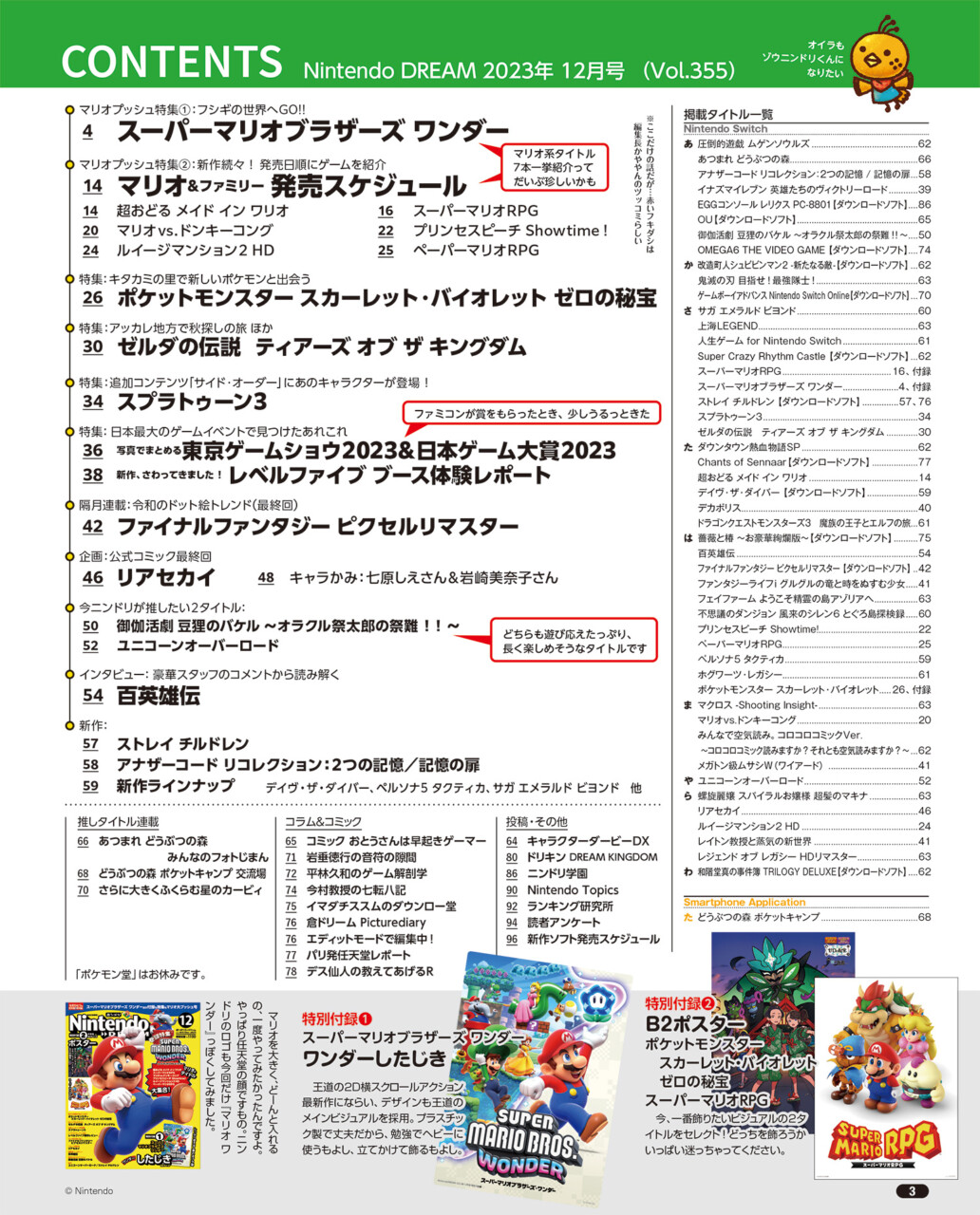 ニンテンドードリーム 23年12月号:付録はマリオワンダー下敷き、ポケモンS・V ゼロの秘宝/マリオRPGのポスター