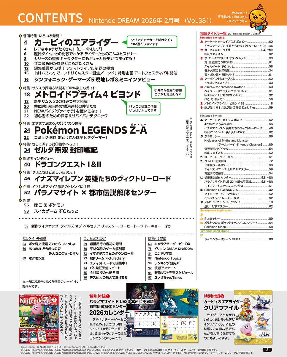ニンテンドードリーム 26年2月号:付録はパラノマサイト×都市伝説解体センター2026年カレンダー/カービィのエアライダーA5クリアファイル