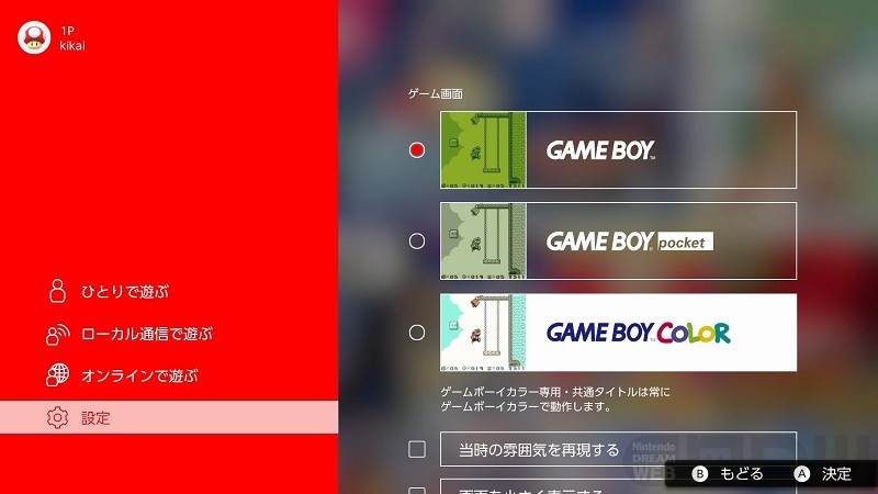 また、「ゲームボーイ」は設定している画面(ゲームボーイ/ゲームボーイポケット/ゲームボーイカラー)によって起動画面も変わります。