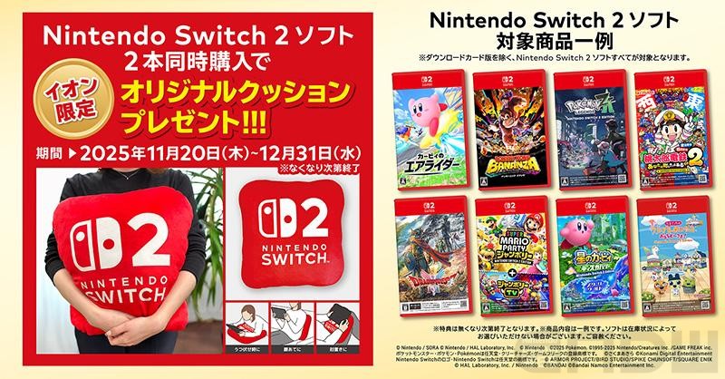 Nintendo Switch 2 ソフト2本同時購入で、イオン限定オリジナルクッションをプレゼント。本州(東北除く)・四国のイオン直営ゲーム取扱店舗が対象となっています。