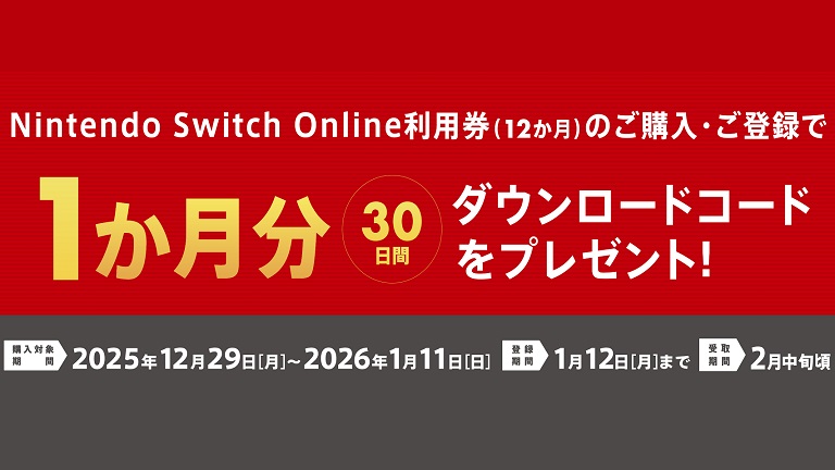 2025年12月29日(月)から2026年1月11日(日)のキャンペーン期間中に、セブン-イレブン各店舗にて「Nintendo Switch Online利用券(12か月券)」を購入し、キャンペーンサイトから必要事項を記入して応募することで、「Nintendo Switch Online 1か月(30日間)利用コード」がプレゼントされます。