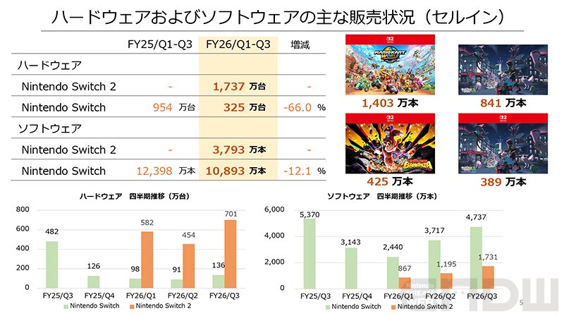 任天堂は2026年3月期第3四半期(2025年4月~2025年12月)決算説明資料を公開し、2025年発売のハードウェア「Nintendo Switch 2」の累計販売台数が過去最速ペースで1,500万台を突破したことを発表しました。