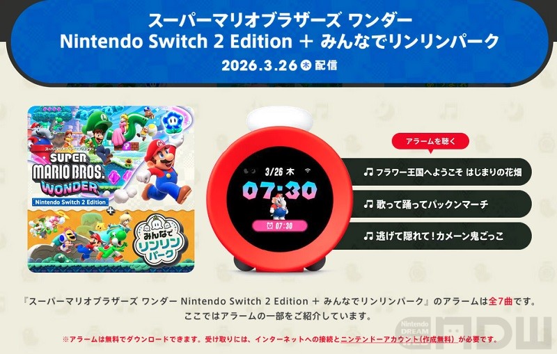 体の動きに反応する時計「ニンテンドーサウンドクロック Alarmo(アラーモ)」に『スーパーマリオブラザーズ ワンダー Nintendo Switch 2 Edition + みんなでリンリンパーク』のアラームが追加されました。アラームはインターネットに接続して無料でダウンロードが可能です。
