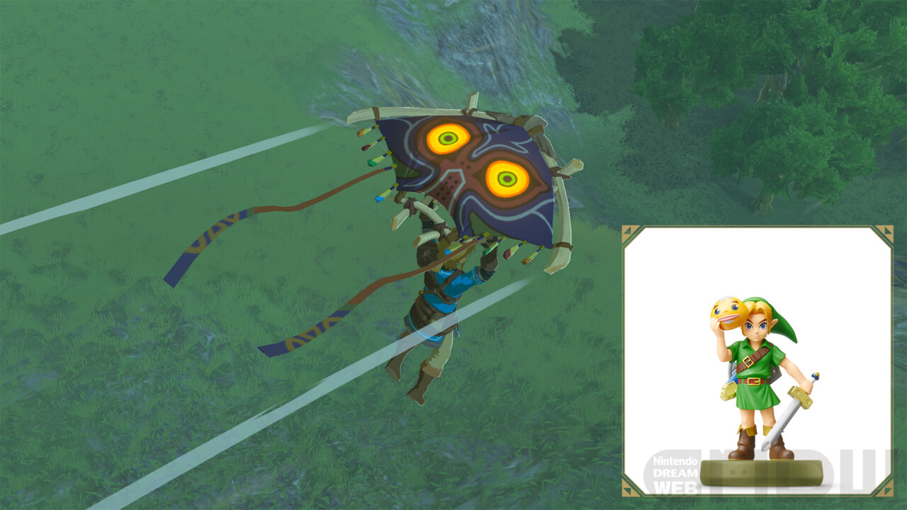 また、『ゼルダの伝説』シリーズのamiiboをタッチすると、冒険に役立つ素材や武器のほか、特別な「パラセールの生地」が手に入ることがあります。ゲーム内のとあるお店で、生地を張り替えることができるようです。