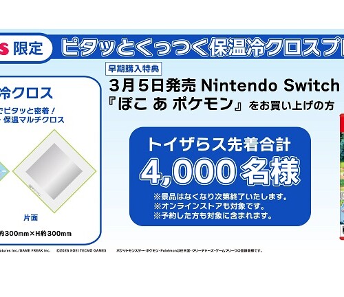 全国のトイザらスにて、Nintendo Switch2ソフト『ぽこ あ ポケモン』を購入すると、先着4,000名に保温冷クロスがプレゼントされます。 ...