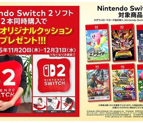 イオンにて、Nintendo Switch 2 ソフト2本購入でオリジナルクッションがもらえるキャンペーンを実施中。ホリデーセットも