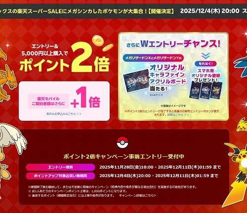 楽天ブックスで「楽天スーパーSALEにメガシンカしたポケモンが大集合!」キャンペーンが開催。Wエントリーでグッズが当たる