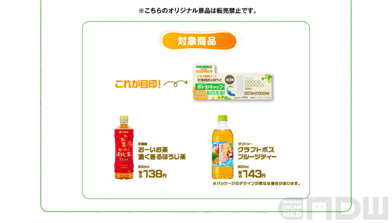 対象商品を1個ご購入ごとに、キャンペーン限定の「ボトルキャップ」がもらえます。オリジナルデザイン「ボトルキャップ」は全部で8種あり、好きなピクミンを選べます。集めると、繋がったイラストを楽しむこともできます。