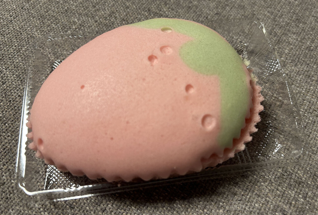生地にいちご100%ピューレを使用しているそうです。なるほど。蒸しパン自体は生地の密度が高い系で、そんなに甘くもありません。もちろんヘタも食べられます。