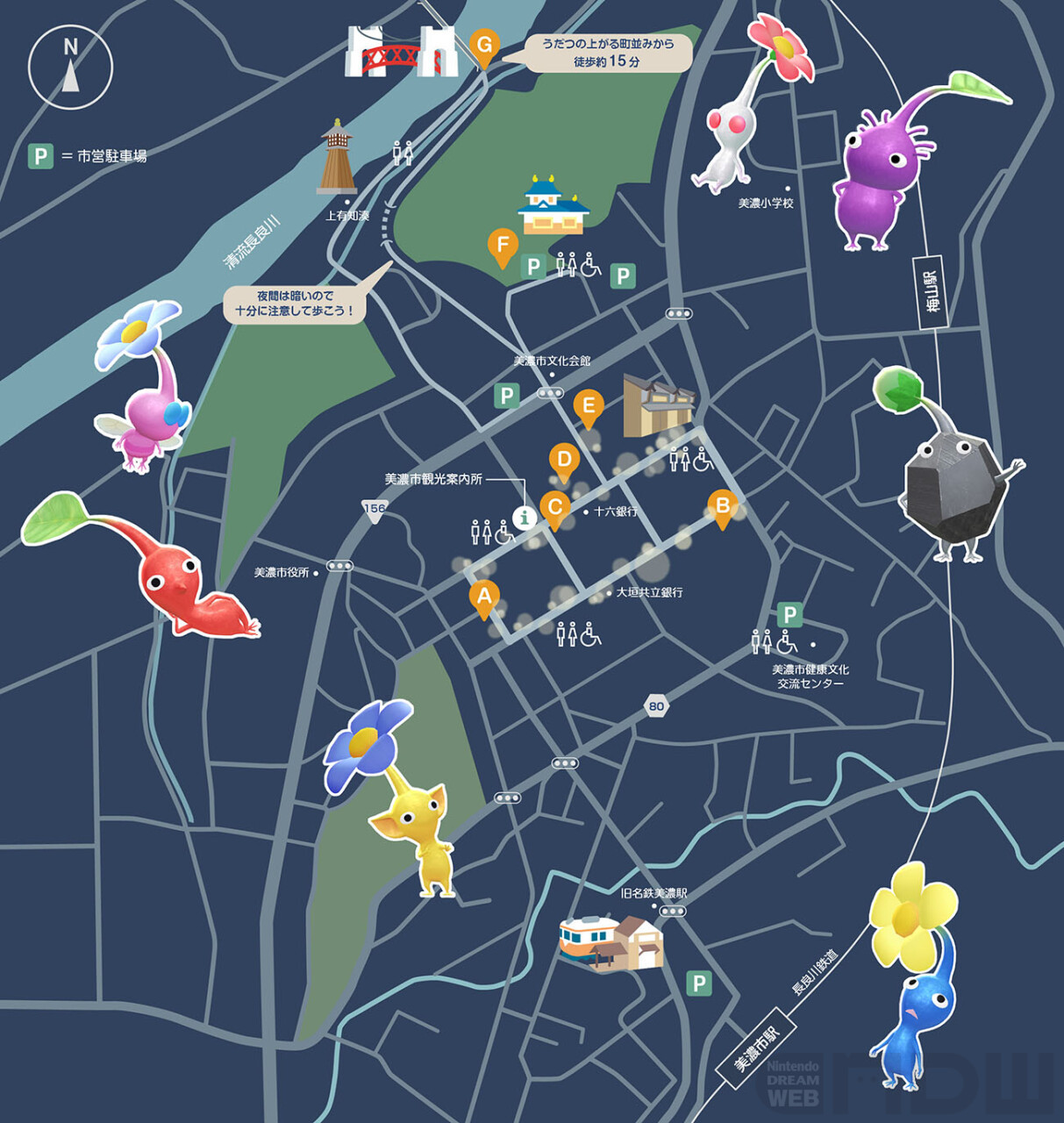 「美濃和紙あかりアート展」の会場である「うだつの上がる町並み」周辺に設置された7か所に美濃和紙で作られたピクミンのオブジェ「ピクミンのあかり」が設置され、ピクミン探しを楽しめます。Pikmin Bloomアプリ内で、「ピクミンのあかり」からその場所にちなんだデコピクミンの金の苗が受け取れます。