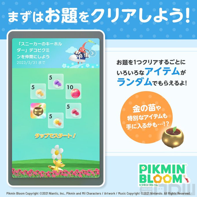 【お題一覧】『ピクミンブルーム』「スニーカーのキーホルダー」デコピクミンの金の苗がもらえる「イベントチャレンジ」が開催中