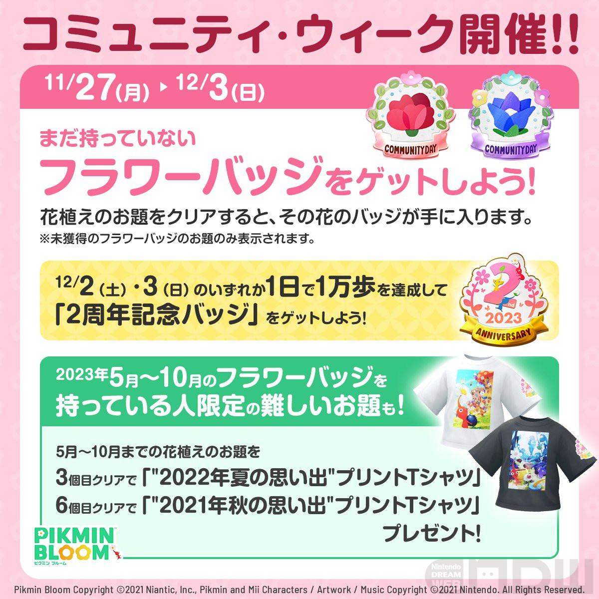 2周年イベントの最後を飾るコミュニティ・ウィークでは、これまで取り逃していたフラワーバッジの再獲得や2周年バッジ、思い出Tシャツなど、さまざまなものが手に入りますので、お祭りをみんなで楽しみましょう。